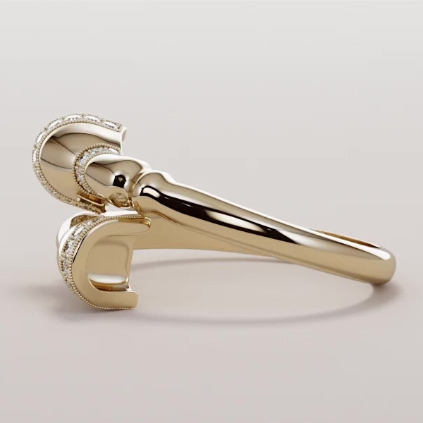 Horse Leg And Hoof Ring With Stripe White Diamonds. Skyros Named after the island tied to heroic myth and destiny, this ring embodies strength, groundedness, and timeless elegance. The Skyros features a meticulously crafted horse leg and hoof motif, a symbol of power and grace, adorned with a striking stripe of white diamonds that catch light with refined brilliance. Each diamond is precisely set to enhance the sculptural design, creating a piece that commands attention while maintaining sophisticated restraint. This is jewelry for those who appreciate symbolic depth—a wearable narrative that speaks to resilience and mythic heritage. The combination of bold imagery and delicate diamond detailing makes Skyros a distinctive statement ring that transcends fleeting trends, offering lasting presence on the hand.